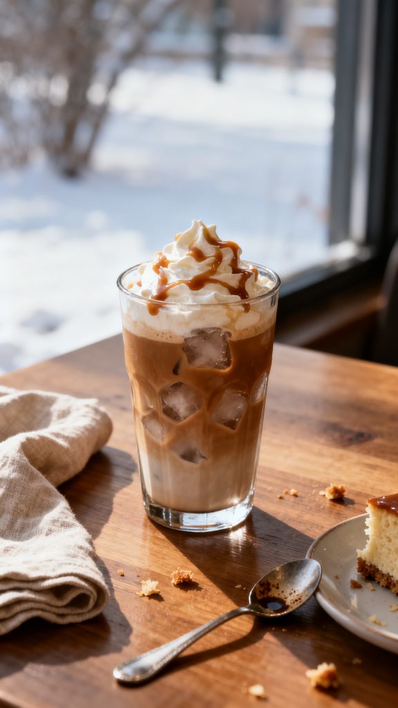 This iced coffee drink for Christmas feels seasonal without relying on spice. Maple syrup rounds the coffee, caramel adds depth, and the drink stays balanced.