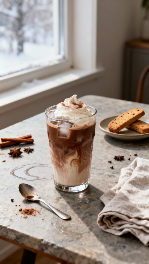 This iced coffee drink for Christmas balances familiar warmth with a lighter finish. Chocolate adds depth, cinnamon brings subtle spice, and coffee keeps everything grounded.