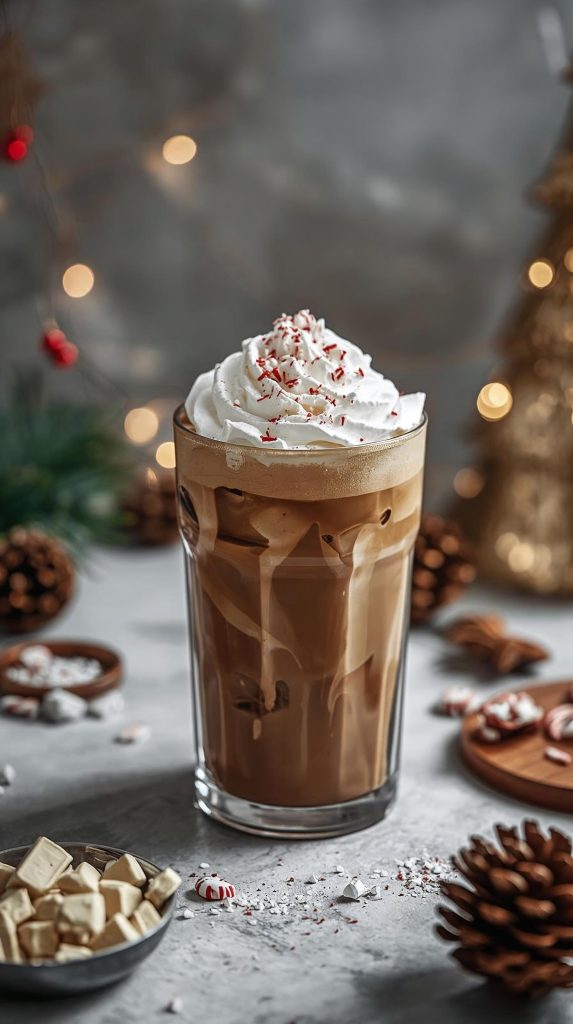 This iced coffee drink for Christmas leans festive without becoming heavy. White chocolate adds sweetness, peppermint keeps it clean, and coffee anchors the drink.