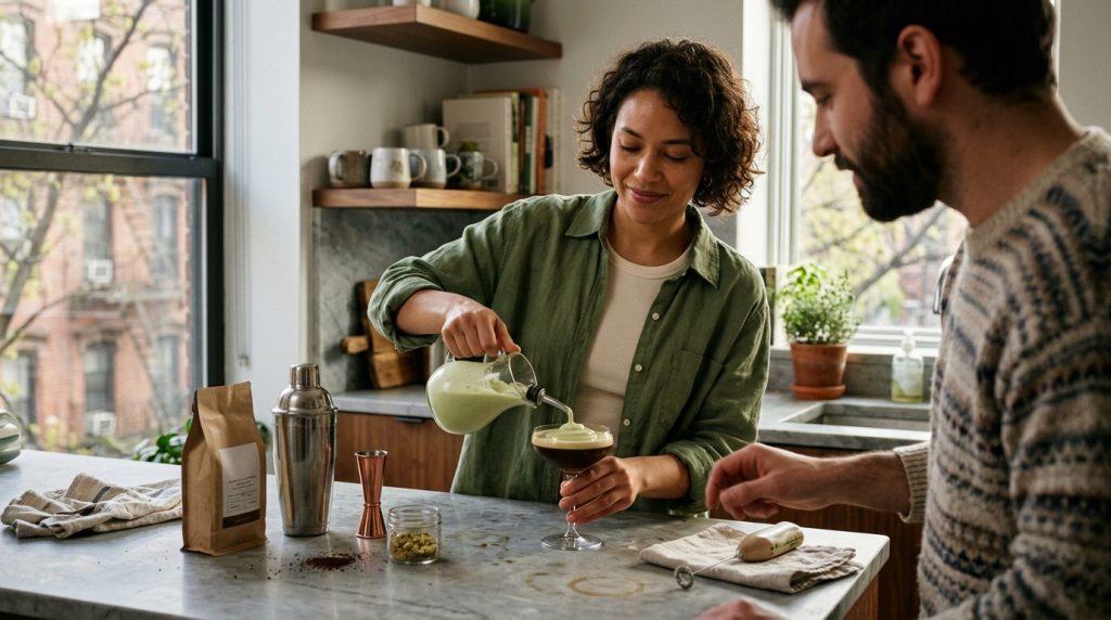 Late afternoon light spilling across a marble kitchen island reveals a beautiful shift in home mixology. The sharp, simple silhouette of the traditional coffee cocktail has evolved into something richer and more intentional. This spring, the defining element of the perfect slow-sipping evening is undeniably pistachio cold foam. As we move away from high-acid, jitter-inducing drinks, this visually striking, velvety green layer offers a moment of quiet luxury and grounded indulgence.